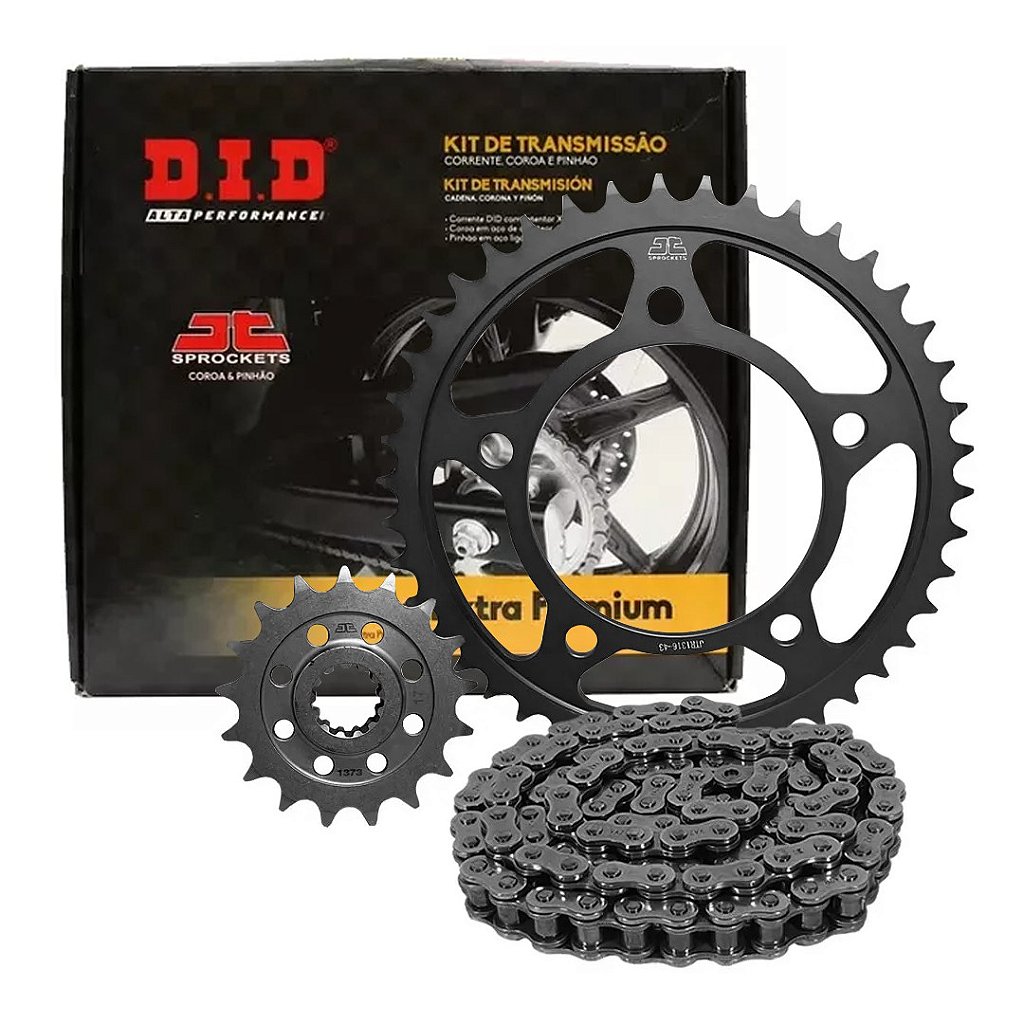 Qualidade High Premium, melhor desempenho e durabilidade A parceria DID e JT SPROCKETS trouxe para o Brasil o que há de melhor em desempenho e durabilidade. A Linha Extra Premium é composta por correntes DID Séries V0, VX e ZVM-X, produzidas no Japão. As coroas e pinhões JT são fabricadas com alto nível de qualidade com o que há de melhor em resistência e leveza. Todos os kits contam com tecnologia que os tornam superiores aos originais de fábrica. Tudo para garantir a melhor performance.