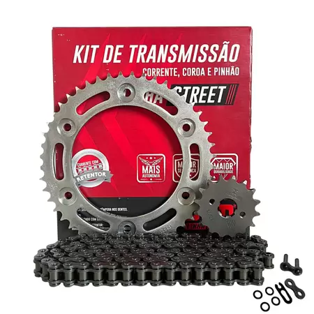 Qualidade, originalidade, segurança e durabilidade O Kit de Transmissão Linha Street é composto por corrente, elo mestre de emenda, coroa e pinhão. Reúne em um único produto, os elementos principais para a substituição correta do conjunto de transmissão. Os produtos têm qualidade Premium, são feitos com material nobre, pensados para proporcionar praticidade, segurança e resistência para o dia a dia do motociclista. As coroas possuem têmpera nos dentes, que oferece melhor resistência ao desgaste. Já os pinhões são feitos com aço 8620 e passam por tratamento térmico, proporcionando maior durabilidade ao componente.